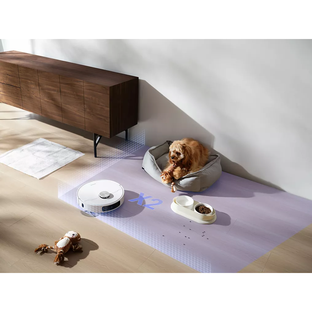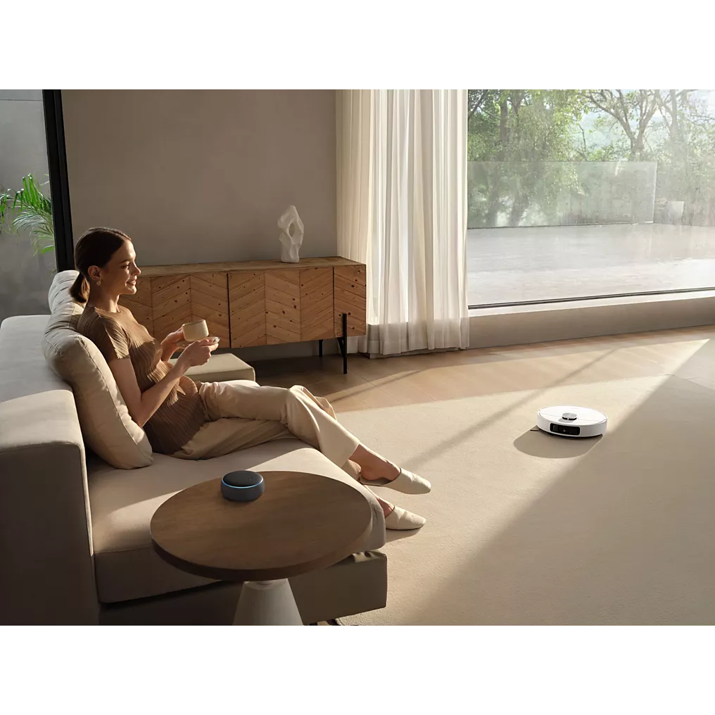 • Serpillère déportée : le robot est capable de nettoyer plus efficacement les angles et bords des murs en déployant sa serpillière vers l’extérieur.