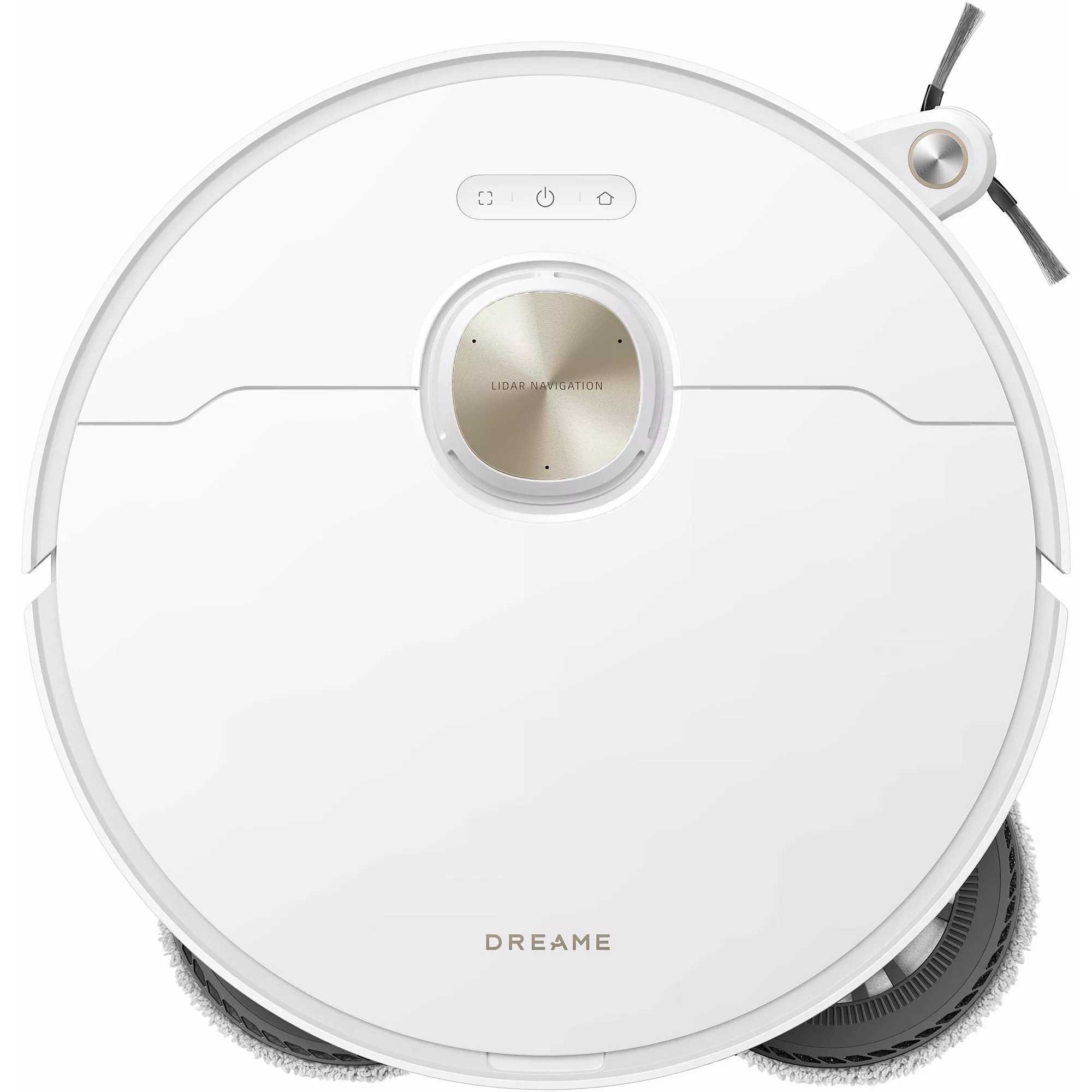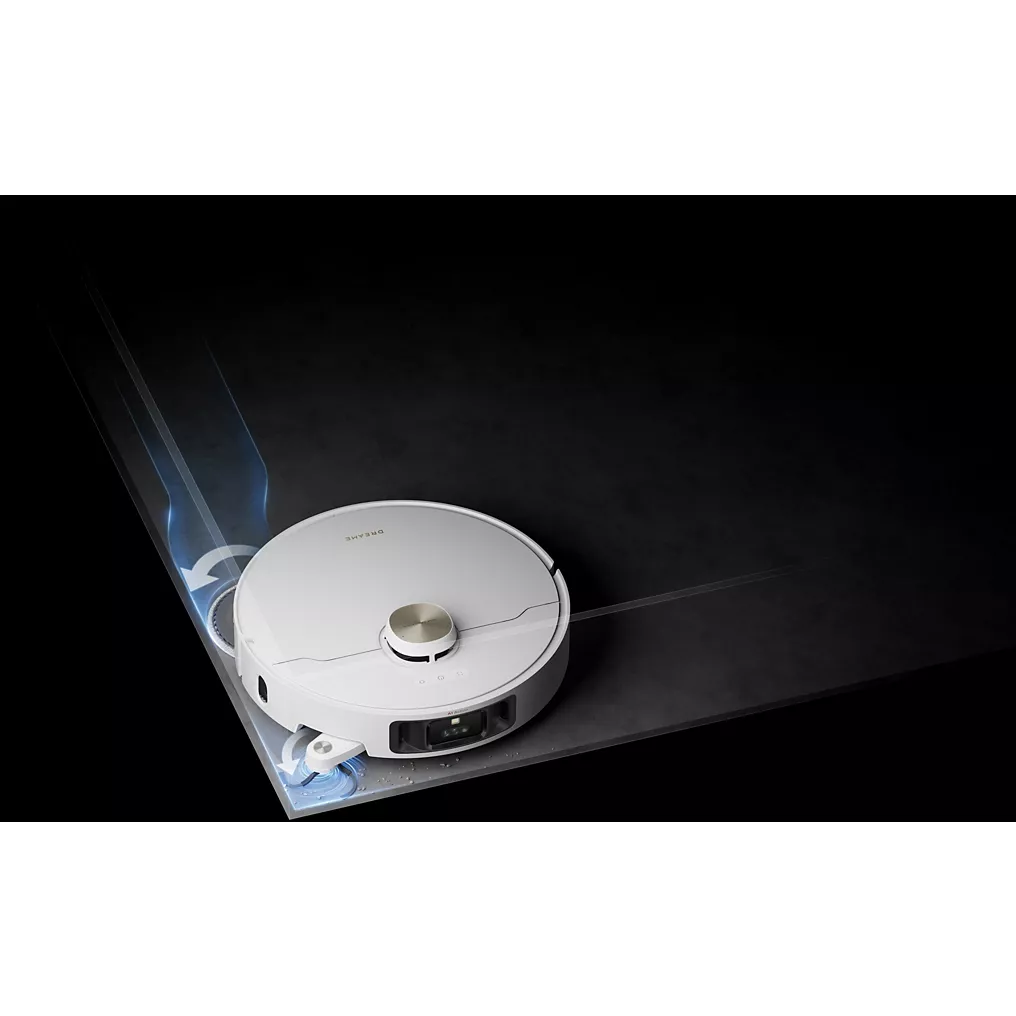 - Brosse latérale déportée : le robot est capable de ramasser la poussière plus efficacement dans les angles et le bord des murs en déployant sa brosse latérale vers l’extérieur.