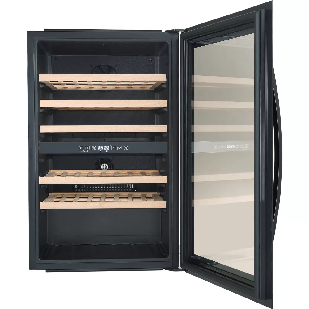 - Type de porte : vitrée, permet de visualiser facilement les bouteilles sans avoir à ouvrir la porte, ce qui réduit la circulation de l’air dans la cave et donc la variation de la température. Le traitement anti-uv protège le contenu.