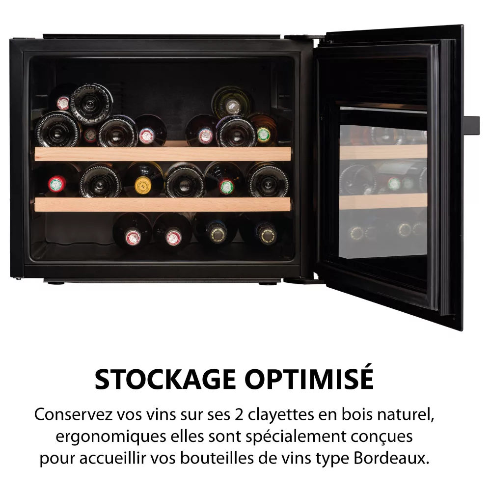 L’intérieur est équipé de clayettes en bois naturel, conçues pour maintenir vos bouteilles à l’horizontale. Cela permet de préserver l’élasticité des bouchons et de garantir une conservation stable.
