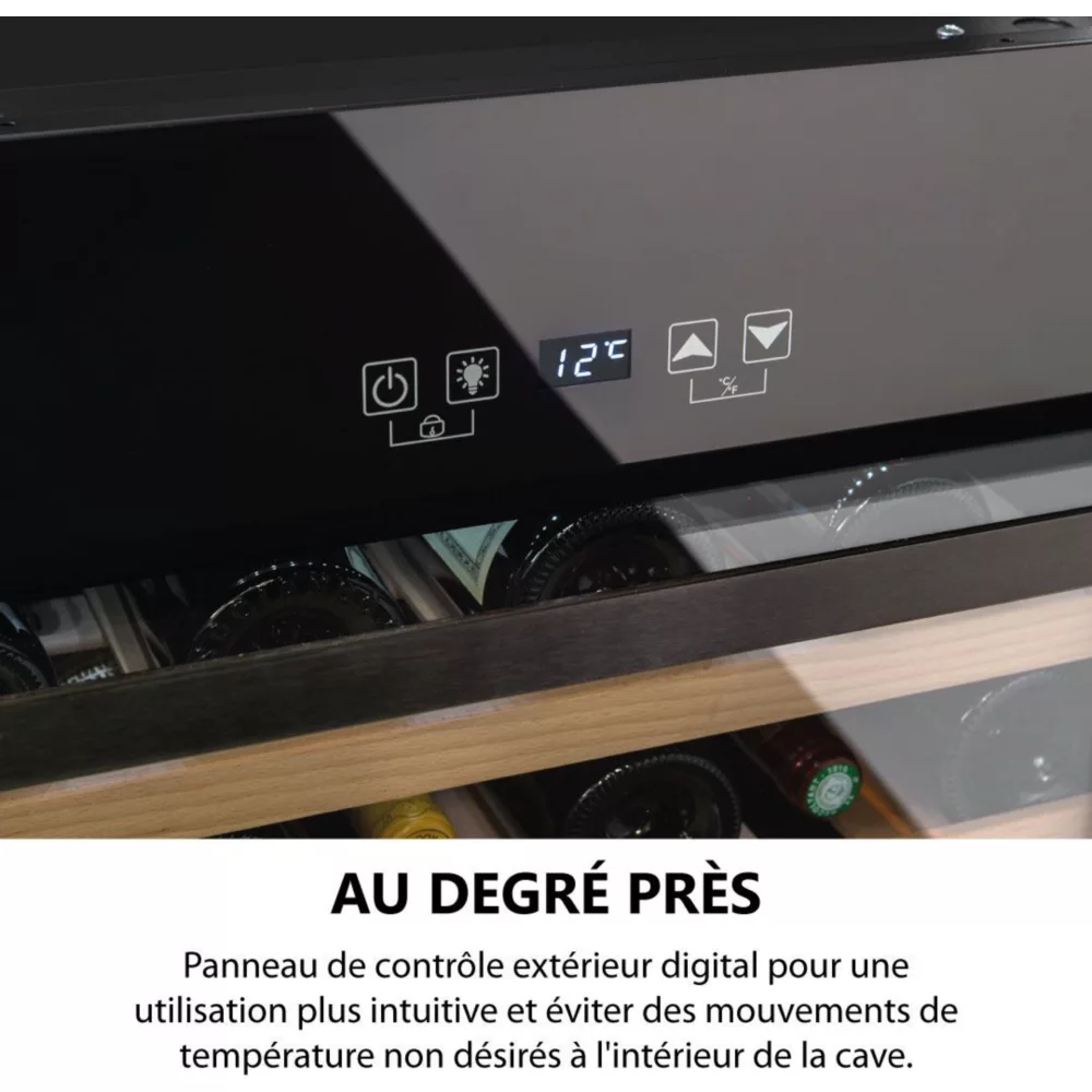 Cette cave offre un système de contrôle de température précis. Ainsi, vous pouvez ajuster la température selon les besoins de vos vins, que ce soit pour le stockage à long terme ou la mise à température de service.