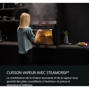 Le four encastrable AEG BSE77228BM SteamCrisp améliore la qualité de cuisson grâce à l’ajout de vapeur, offrant des aliments dorés, croustillants et juteux. Son design moderne s’intègre parfaitement dans les cuisines contemporaines.