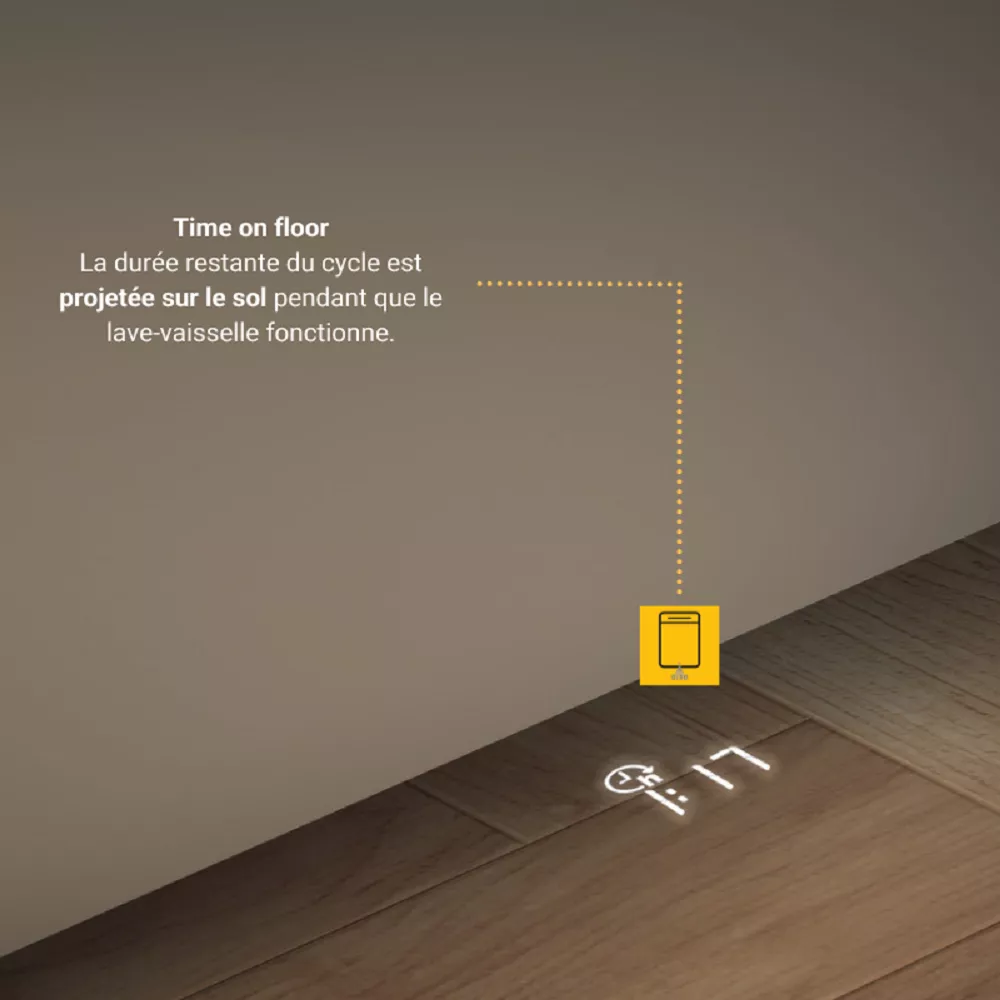 Les points clés Tout encastrable avec panneau de commande invisible L x H x P : 59.8 x 82 x 55.5 cm ultra silencieux 38 dB – Label énergie B Rangement couverts : Tiroir Le + : Vérifiez instantanément le temps restant du cycle, projeté sur le sol pendant le fonctionnement.