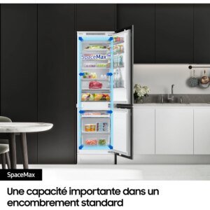 Le réfrigérateur combiné encastrable SAMSUNG BRB26705EWW Metal Cooling associe design intégré, grande capacité et technologies avancées pour une conservation efficace des aliments au quotidien, tout en s’intégrant discrètement dans votre cuisine équipée.
