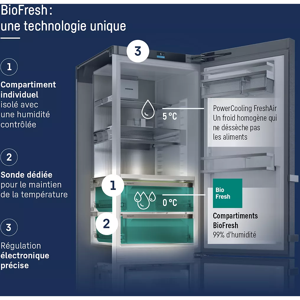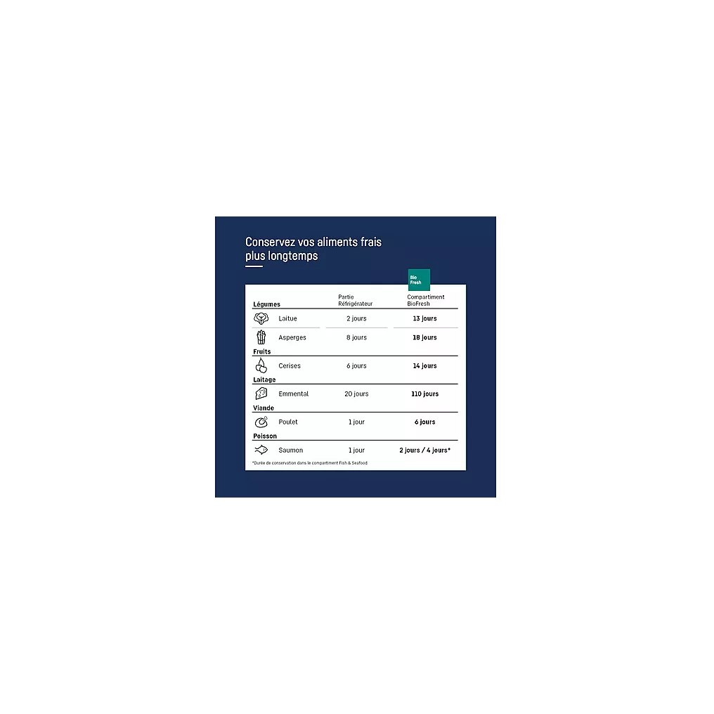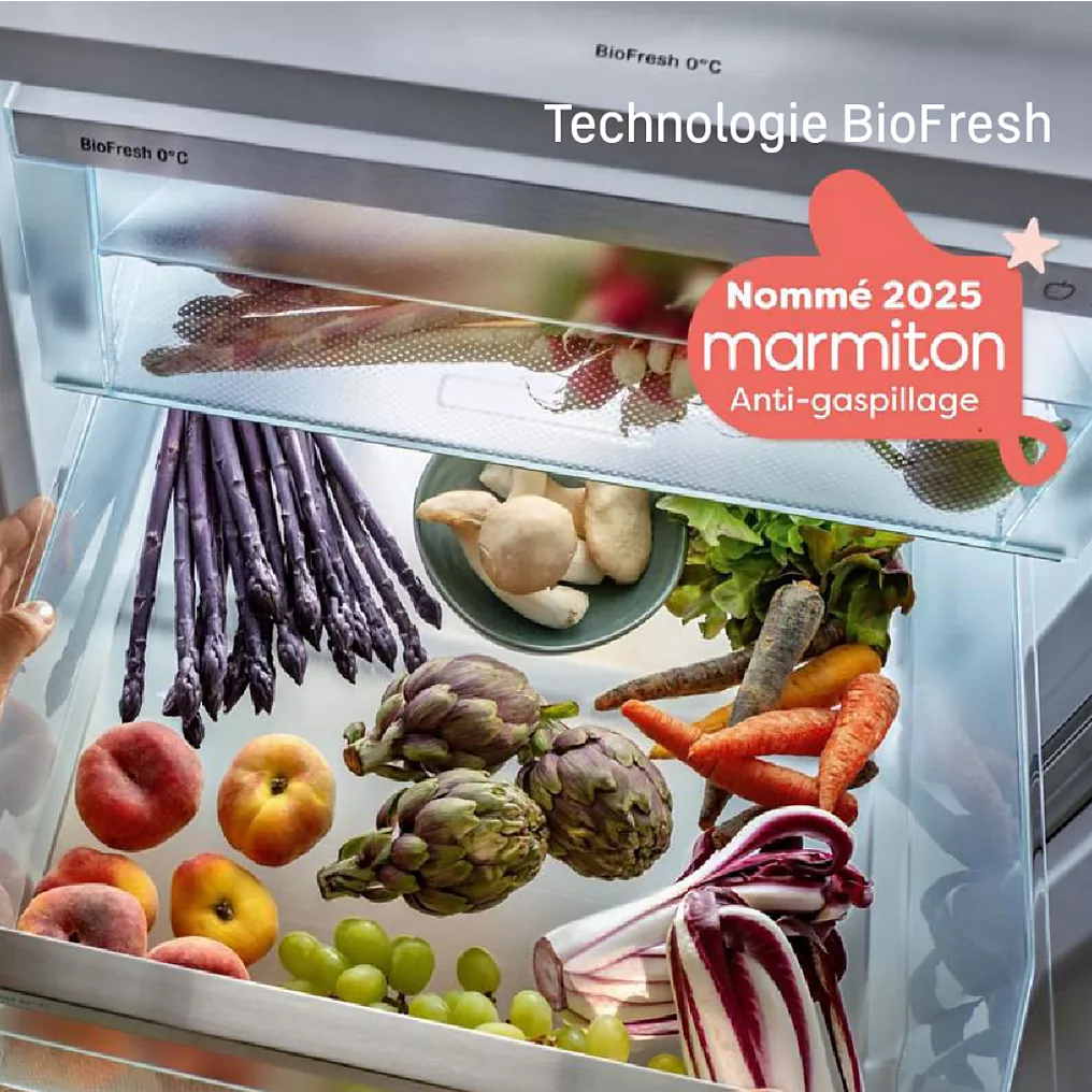 - Le + : Tiroir BioFresh: conservation parfaite des aliments frais jusqu’à 5 fois plus longtemps