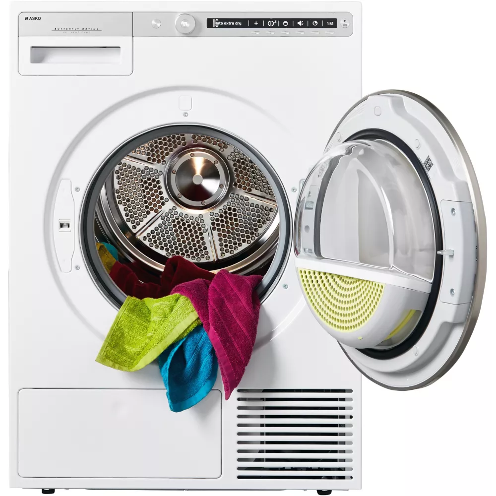 Le sèche-linge T411HD.W d’Asko dispose de la technologie de séchage Butterfly : un mouvement en continu et une rotation alternée évitent le tassement des vêtements, tandis que le tambour Soft Drum améliore le flux d’air autour des vêtements. Le résultat : des textiles séchés de façon homogène et une fibre préservée plus longtemps.