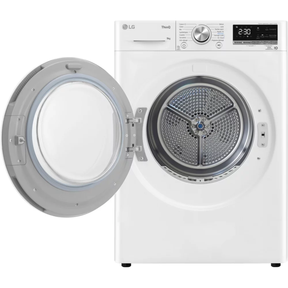 Le sèche-linge pompe à chaleur LG RH9V51WH combine grande capacité, technologie DUAL Inverter et connectivité intelligente pour un séchage efficace, économique et respectueux des textiles.