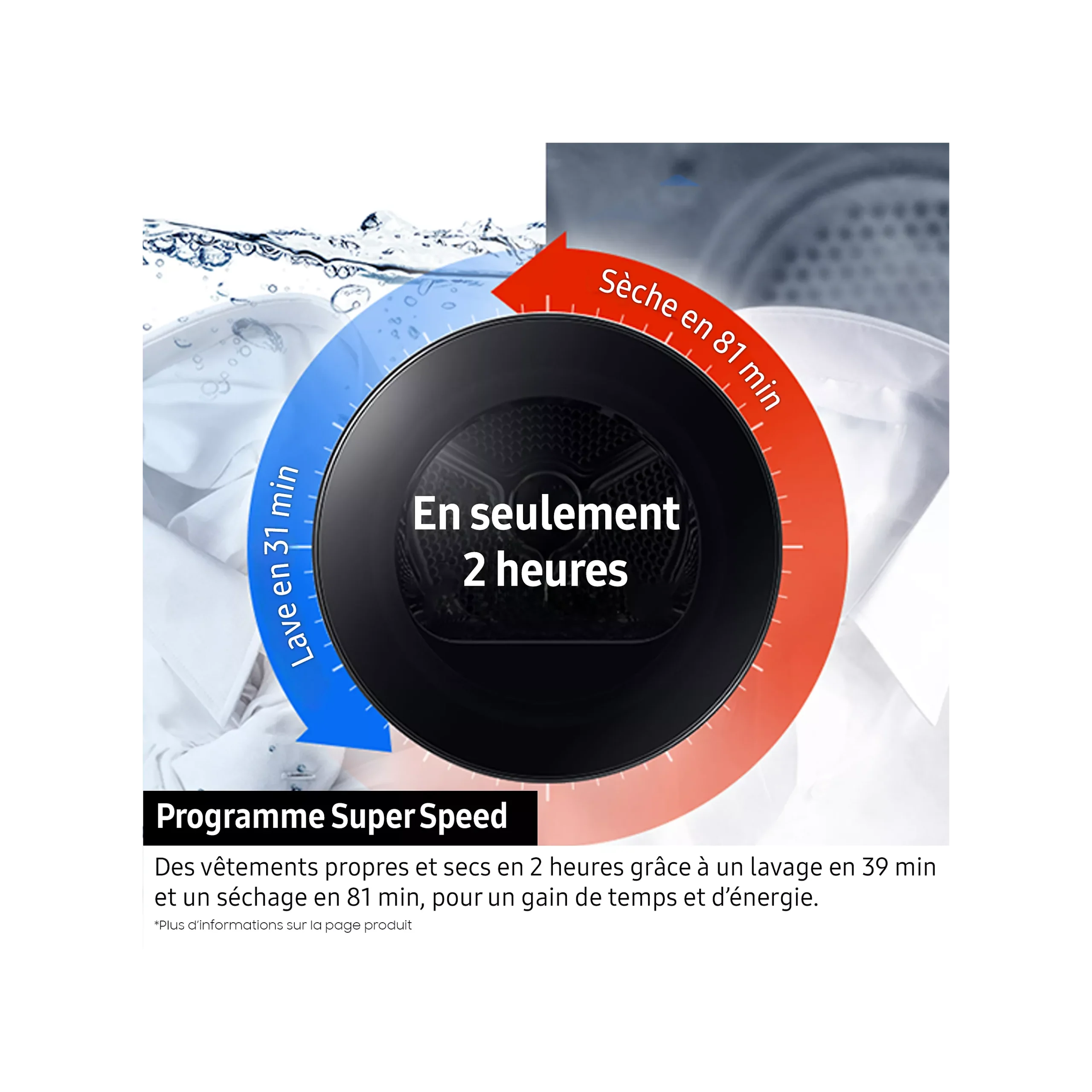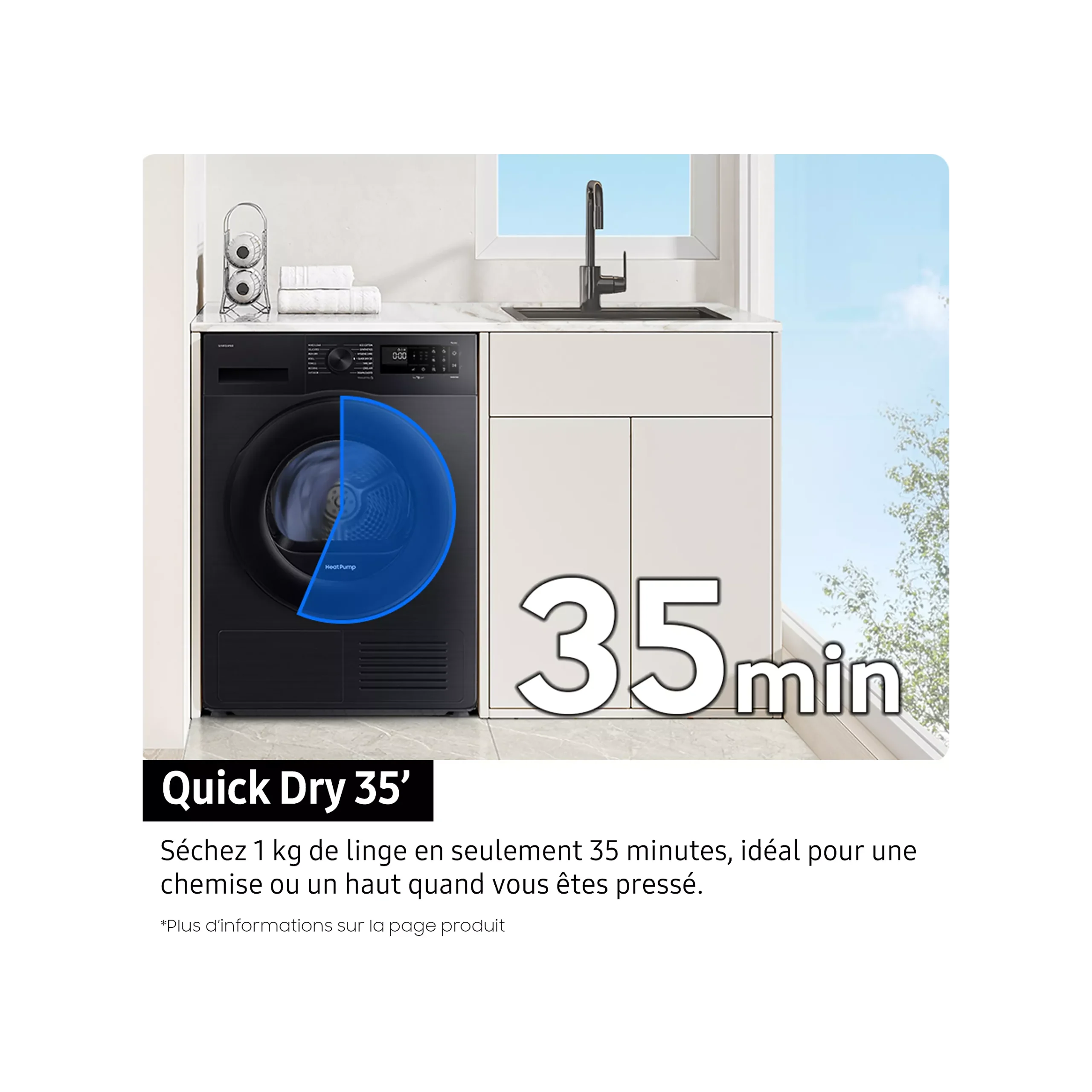 Le sèche-linge à pompe à chaleur Samsung DV90DG6845LK 9 kg combine technologie avancée et efficacité énergétique pour un séchage précis, économique et respectueux des textiles.